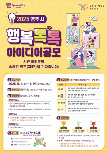 [NWS¹æ¼Û=Çѽ¸ñ ±âÀÚ]°æÁֽô ½Ã¹Î°úÀÇ ¼ÒÅëÀ» °­È­Çϰí âÀÇÀûÀÎ ½ÃÁ¤ °³¼± ¾ÆÀ̵ð¾î¸¦ ¹ß±¼Çϱâ À§ÇØ ¡®2025³â °æÁֽà ÇູÅåÅå ¾ÆÀ̵ð¾î °ø¸ð¡¯¸¦ ÁøÇà ÁßÀ̶ó°í 6ÀÏ ¹àÇû´Ù. À̹ø °ø¸ð´Â 5¿ù 1ÀϺÎÅÍ ½ÃÀ۵Š¿À´Â 6¿ù 19ÀϱîÁö 50¡¦