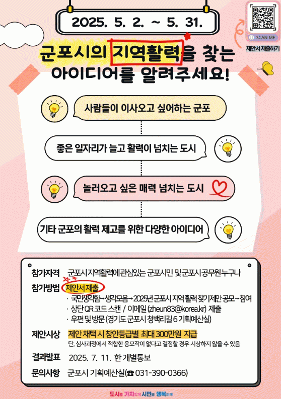 [NWS¹æ¼Û=Çѽ¸ñ ±âÀÚ]±ºÆ÷½Ã´Â ½Ã¹Î°ú ÇÔ²² Áö¿ªÀÇ È°·ÂÀ» µÇã°í µµ½Ã °æÀï·ÂÀ» ³ôÀ̱â À§ÇØ ¿À´Â 5¿ù 2ÀϺÎÅÍ 5¿ù 31ÀϱîÁö ¡º2025³â ±ºÆ÷½Ã Áö¿ª Ȱ·Â ã±â Á¦¾È °ø¸ð¡»¸¦ ½Ç½ÃÇÑ´Ù°í ¹àÇû´Ù. À̹ø °ø¸ð´Â ±ºÆ÷½ÃÀÇ Áö¿ª Ư¼º°ú ¿©°Ç¡¦