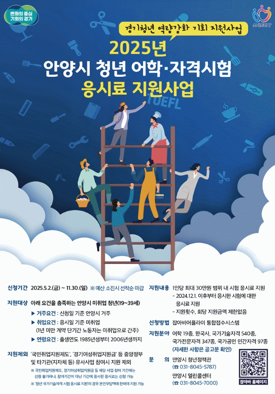 [NWS¹æ¼Û=ÇãÀº¼­ ±âÀÚ]¾È¾ç½Ã´Â ¹ÌÃë¾÷ û³âµéÀÇ ¾îÇС¤ÀڰݽÃÇè ÀÀ½Ã·á¸¦ ÃÖ´ë 30¸¸¿ø±îÁö Áö¿øÇÏ´Â ¡®°æ±âû³â ¿ª·®°­È­ ±âȸ Áö¿ø»ç¾÷¡¯À» ½Ç½ÃÇÑ´Ù°í 6ÀÏ ¹àÇû´Ù. Áö¿ø ´ë»óÀº ½ÅûÀÏ ±âÁØ ¾È¾ç½Ã¿¡ °ÅÁÖÇÏ´Â 19¼¼~39¼¼(1985³â»ý~20¡¦