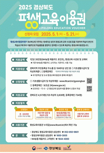 [NWS¹æ¼Û=Çѽ¸ñ ±âÀÚ]°æºÏµµ´Â ÀÌ´Þ 21ÀϱîÁö µµ³» °ÅÁÖÇÏ´Â ¸¸ 19¼¼ ÀÌ»ó ¼ºÀÎÀ» ´ë»óÀ¸·Î 2025³â 1Â÷ Æò»ý±³À°ÀÌ¿ë±Ç ½ÅûÀ» ¹Þ´Â´Ù. À̹ø ½ÅûÀº ±âÃÊ»ýȰ¼ö±ÞÀÚ, Â÷»óÀ§°èÃþ, µî·Ï Àå¾ÖÀÎÀ» ÁÖ¿ä ´ë»óÀ¸·Î Çϸç, ÃÑ 4,573¸íÀÌ Áö¿øÀ»¡¦
