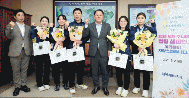 [NWS¹æ¼Û=Çѽ¸ñ ±âÀÚ]ÀüºÏƯº°ÀÚÄ¡µµ´Â 2ÀÏ, ¼¼°è ¹«´ë¿¡¼­ ¿ì½ÂÀ» Â÷ÁöÇÑ ÀüºÏ ÄøµÆÀ¿¡ ÃàÇÏ¿Í °¨»ç¸¦ ÀüÇÏ¸ç °Ý·ÁÇÏ´Â ÀÚ¸®¸¦ °¡Á³´Ù. ÀüºÏ ÄøµÆÀÀº Áö³­ 4¿ù 12ÀϺÎÅÍ 21ÀϱîÁö ÀÌÅ»¸®¾Æ¿¡¼­ ¿­¸° 2025 ¼¼°èÁִϾîÄøµ¼±¼ö±Ç´ëȸ¿¡¡¦