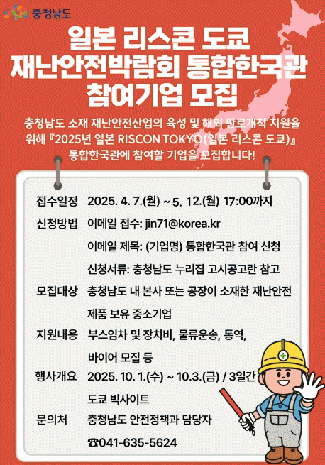 [NWS¹æ¼Û=ÇãÀº¼­ ±âÀÚ] Ãæ³²µµ´Â ¡®2025 ¸®½ºÄÜ µµÄì(RISCON TOKYO)¡¯ Âü¿©±â¾÷ ¸ðÁý °ø°í ±â°£À» ¿À´Â 12ÀϱîÁö ¿¬ÀåÇÑ´Ù°í 2ÀÏ ¹àÇû´Ù. 10¿ù 1ÀϺÎÅÍ 3ÀϱîÁö ÀϺ»¿¡¼­ ¿­¸®´Â ¸®½ºÄÜ µµÄì(À§±â °ü¸® »ê¾÷ Àü½Ãȸ)´Â ¡®À§±â °ü¸®¡¯¡¦