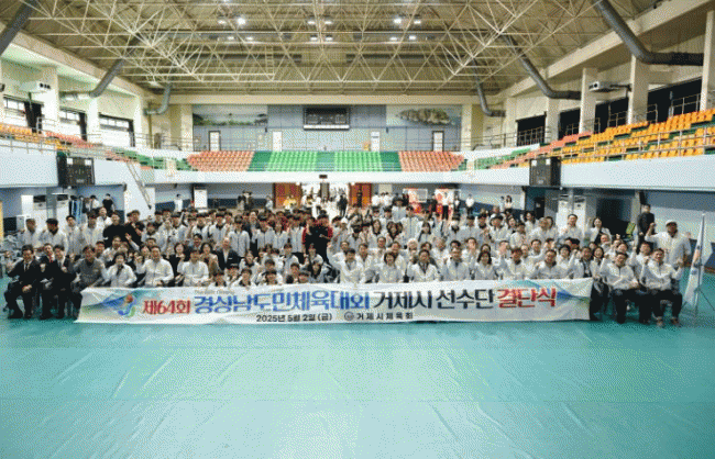[NWS¹æ¼Û=¼­Çö¼® ±âÀÚ]°ÅÁ¦½Ã´Â 2ÀÏ, °ÅÁ¦½ÃüÀ°°ü¿¡¼­ ¡®Á¦64ȸ °æ»ó³²µµ¹ÎüÀ°´ëȸ¡¯¿¡ Âü°¡ÇÏ´Â °ÅÁ¦½Ã ¼±¼ö´ÜÀÇ °á´Ü½ÄÀ» °³ÃÖÇß´Ù. À̳¯ °á´Ü½Ä¿¡´Â º¯±¤¿ë °ÅÁ¦½ÃÀåÀ» ºñ·ÔÇØ °ÅÁ¦½ÃÀÇȸ ÀÇÀå, üÀ°È¸Àå, Á¾¸ñº° ¼±¼ö ¹× ÀÓ¿ø µî ¡¦