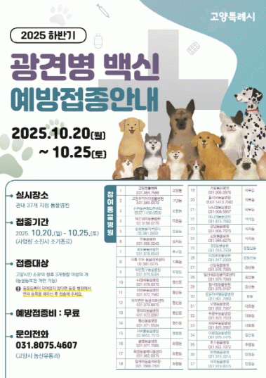 [NWS¹æ¼Û=Çѽ¸ñ ±âÀÚ]°í¾çƯ·Ê½Ã´Â 2025³â ÇϹݱ⠱¤°ßº´ ¿¹¹æÁ¢Á¾À» 10¿ù 20ÀϺÎÅÍ ½Ç½ÃÇÑ´Ù°í ¹àÇû´Ù. ±¤°ßº´Àº ÁÖ·Î ¾ß»ýµ¿¹°¿¡ ÀÇÇØ ÀüÆÄµÇ¸ç °¨¿°µÈ ¹Ý·Áµ¿¹°¿¡¼­ »ç¶÷¿¡°Ô Àü¿°µÉ ¼ö ÀÖ´Â Ä¡¸íÀûÀÎ Àμö°øÅëÀü¿°º´ÀÌ´Ù. ÀÌ¿¡ µû¡¦