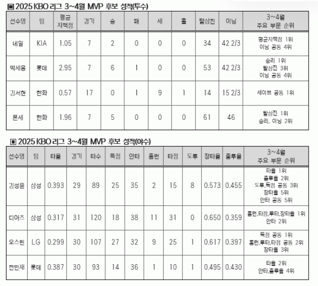 [½ºÆ÷Ã÷] 2025 ½ÅÇÑ SOL¹ðÅ© KBO ¸®±× 3~4¿ù ¿ù°£ MVP Èĺ¸ ¹ßÇ¥ |2025. 05.02
