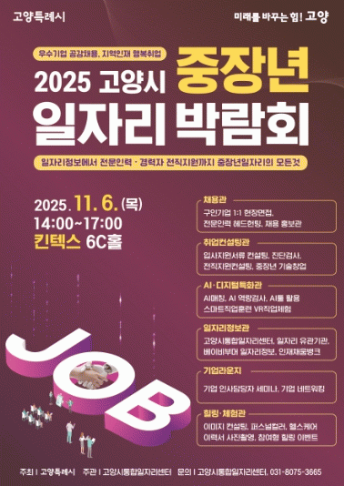 [NWS¹æ¼Û=ÇãÀº¼­ ±âÀÚ]°í¾çƯ·Ê½Ã´Â ¿À´Â 11¿ù 6ÀÏ Å²ÅØ½º Á¦2Àü½ÃÀå 6CȦ¿¡¼­ ¿­¸®´Â¡®2025 °í¾ç½Ã ÁßÀå³â ÀÏÀÚ¸®¹Ú¶÷ȸ¡¯¿¡ Âü¿©ÇÒ ±¸Àαâ¾÷À» ¸ðÁýÇÑ´Ù°í ¹àÇû´Ù. À̳¯ Çà»ç´Â ÁßÀå³âÃþ ±¸Á÷ÀÚ¿Í Ã¤¿ë ¼ö¿ä°¡ ÀÖ´Â ±â¾÷ °£ÀÇ È¿À²ÀûÀΡ¦