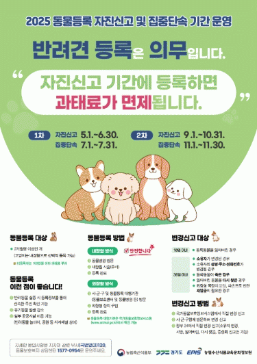 [NWS¹æ¼Û=Çѽ¸ñ ±âÀÚ]¾çÆò±ºÀº ¹Ý·Áµ¿¹° º¸È£¿Í À¯±â¡¤À¯½Ç ¹æÁö, µ¿¹°µî·ÏÁ¦ ÀÎ½Ä Á¦°í¸¦ À§ÇØ 5¿ù 1ÀϺÎÅÍ 6¿ù 30ÀϱîÁö 1Â÷ µ¿¹°µî·Ï ÀÚÁø½Å°í ±â°£À» ¿î¿µÇÑ´Ù°í ¹àÇû´Ù. 2Â÷ ÀÚÁø½Å°í ±â°£Àº 9¿ù 1ÀϺÎÅÍ 10¿ù 31ÀϱîÁöÀ̸ç, °¢ ÀÚ¡¦
