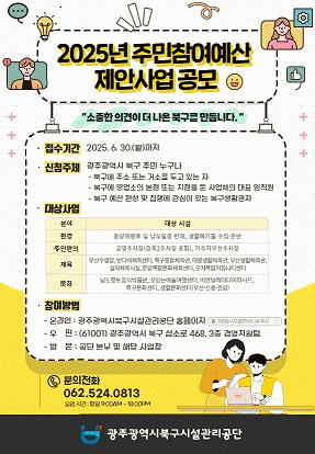[»çȸ] ±¤ÁÖ±¤¿ª½Ã ºÏ±¸½Ã¼³°ü¸®°ø´Ü, ÁÖ¹ÎÂü¿©¿¹»ê Á¦¾È»ç¾÷ °ø¸ð ½Ç½Ã |2025. 05.02