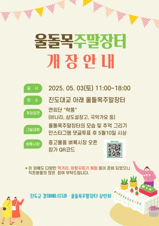 [NWS¹æ¼Û=ÇãÀº¼­ ±âÀÚ]Áøµµ±ºÀº ¡®¿ïµ¹¸ñ ÁÖ¸»ÀåÅÍ¡¯°¡ Áøµµ´ë±³ ¾Æ·¡ ¿ïµ¹¸ñ ±¤Àå¿¡¼­ 5¿ù 3ÀϺÎÅÍ ¸ÅÁÖ Å䡤ÀÏ¿äÀÏ ¿ÀÀü 11½ÃºÎÅÍ ¿ÀÈÄ 6½Ã±îÁö °³ÀåÇÑ´Ù°í ¹àÇû´Ù. ¿ïµ¹¸ñ ÁÖ¸»ÀåÅÍ´Â 5¿ù 3ÀÏ °³Àå½ÄÀ» ½ÃÀÛÀ¸·Î Áøµµ±º¿¡¼­ »ý»êÇÑ Æ¯¡¦