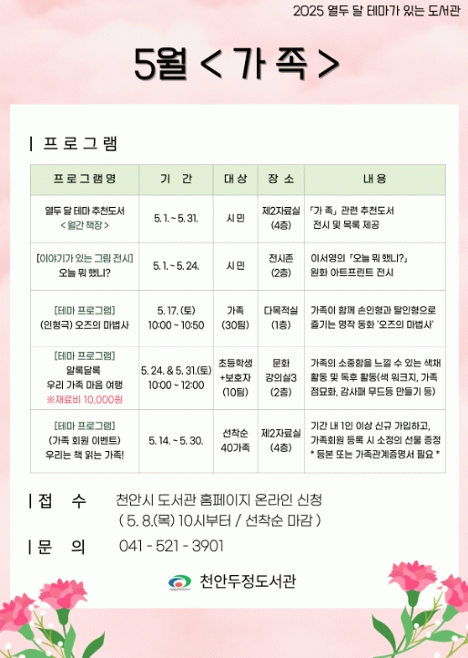 [NWS¹æ¼Û=Çѽ¸ñ ±âÀÚ] õ¾È½Ã µÎÁ¤µµ¼­°üÀº 5¿ù ¡®°¡Á·¡¯À» Å׸¶·Î µµ¼­°üÀ» ¿î¿µÇÑ´Ù°í 2ÀÏ ¹àÇû´Ù. Á¦2ÀÚ·á½Ç¿¡´Â °¡Á·°ú °ü·ÃµÈ Ãßõµµ¼­¸¦, 2Ãþ Àü½ÃÁ¸¿¡¼­´Â µµ¼­ ¡®¿À´Ã ¹¹ Çß´Ï?¡¯ÀÇ ¿øÈ­ ¾ÆÆ®ÇÁ¸°Æ®¸¦ ¸¸³ªº¼ ¼ö ÀÖ´Ù. ¿À¡¦