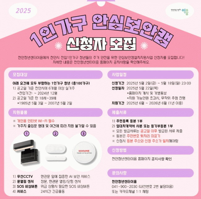[»çȸ] õ¾È½Ã, ¡®¾È½Éº¸¾ÈÄ· ¼³Ä¡ Áö¿ø¡¯ 1Àΰ¡±¸ û³â Áö¿øÀÚ ¸ðÁý |2025. 05.02
