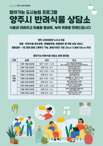 [NWS¹æ¼Û=Çѽ¸ñ ±âÀÚ]¾çÁֽ𡠽ùεéÀÇ Á¤¼­Àû Ä¡À¯¿Í ³ì»ö»ýȰ ½ÇõÀ» µ½±â À§ÇØ 10¿ù 29ÀϱîÁö ¡®Ã£¾Æ°¡´Â ¹Ý·Á½Ä¹° »ó´ã¼­ºñ½º¡¯¸¦ ¿î¿µÇÑ´Ù. À̹ø ÇÁ·Î±×·¥Àº ¾çÁֽóó¾÷±â¼ú¼¾ÅͰ¡ ÃßÁøÇÏ´Â µµ½Ã³ó¾÷ È®»ê ÇÁ·ÎÁ§Æ®ÀÇ ÀÏȯÀ¸·Î, ¡¦