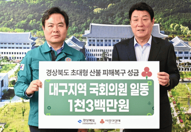 [NWS¹æ¼Û=Çѽ¸ñ ±âÀÚ]´ë±¸Áö¿ª ±¹È¸ÀÇ¿ø 13¸íÀº 1ÀÏ, °æºÏ ÃÊ´ëÇü »êºÒ º¹±¸¿Í ÁֹΠÁö¿øÀ» À§ÇÑ ¼º±Ý 1,300¸¸ ¿øÀ» °æ»óºÏµµ¿¡ Àü´ÞÇß´Ù. À̹ø ¼º±ÝÀº »êºÒ ÇÇÇØ ÀÌÀç¹ÎµéÀÇ ¾ÆÇÄÀ» Ä¡À¯ÇÏ°í ºü¸¥ ÀÏ»ó ȸº¹À» ¹Ù¶ó´Â ¸¶À½À¸·Î ´ë±¸Áö¡¦
