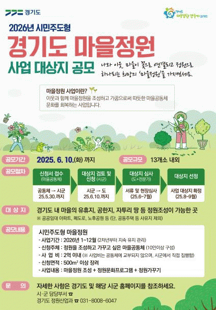 [NWS¹æ¼Û=Çѽ¸ñ ±âÀÚ]°æ±âµµ°¡ ¡®2026³â ½Ã¹ÎÁÖµµÇü ¸¶À»Á¤¿ø Á¶¼º»ç¾÷¡¯ ´ë»óÁö¸¦ °ø°³ ¸ðÁýÇÑ´Ù. ¡®°æ±âµµ ¸¶À»Á¤¿ø Á¶¼º»ç¾÷¡¯Àº ¸¶À»Áֹΰú ´Üü°¡ Á÷Á¢ Á¤¿øÀ» ±âȹÇϰí, Á¶¼º¡¤°ü¸®ÇÏ´Â °æ±âµµÀÇ ´ëÇ¥ ÁÖ¹ÎÂü¿©Çü ³ì»ö»ç¾÷ÀÌ´Ù. ¡¦