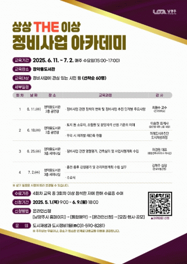 [»çȸ] ³²¾çÁÖ½Ã, ¡®»ó»óTHEÀÌ»ó Á¤ºñ»ç¾÷ ¾ÆÄ«µ¥¹Ì¡¯ ¼ö°­»ý ¼±Âø¼ø ¸ðÁý |2025. 05.01