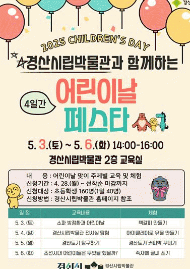 [NWS¹æ¼Û=Çѽ¸ñ ±âÀÚ]°æ»ê½Ã´Â °æ»ê½Ã¸³¹Ú¹°°ü¿¡¼­ ¾î¸°À̳¯°ú ¹Ú¹°°ü¡¤¹Ì¼ú°ü ÁÖ°£À» ¸ÂÀÌÇØ 5¿ù 3ÀϺÎÅÍ 6ÀϱîÁö ¾î¸°À̸¦ À§ÇÑ Ã¼ÇèÇü ±³À° ÇÁ·Î±×·¥ '¾î¸°À̳¯ Æä½ºÅ¸'¸¦ °³ÃÖÇÑ´Ù°í ¹àÇû´Ù. À̹ø Çà»ç´Â ¾î¸°À̵éÀÌ ¹®È­À¯»ê¿¡ ´ë¡¦