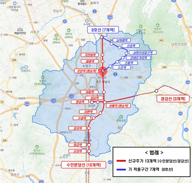 [NWS¹æ¼Û=Çѽ¸ñ ±âÀÚ]¼­¿ï½Ã´Â 5¿ù 3ÀϺÎÅÍ ¡®±âÈĵ¿ÇàÄ«µå¡¯¸¦ ¼º³²½Ã ±¸°£ÀÎ ¼öÀκд缱 °¡Ãµ´ë¿ª~¿À¸®¿ª 10°³ ±¸°£°ú °æ°­¼± À̸Å, ¼º³², ÆÇ±³ 3°³ ¿ª¿¡¼­µµ ÀÌ¿ëÇÒ ¼ö ÀÖ´Ù°í ¹àÇû´Ù. À̷νá, ±âÁ¸ ¼º³²½Ã ±¸°£¿¡¼­ À̿밡´ÉÇß´ø ¡¦