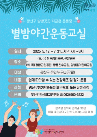 [NWS¹æ¼Û=Çѽ¸ñ ±âÀÚ]±¤ÁÖ ±¤»ê±¸°¡ ½Ã¹Î ´©±¸³ª Àú³á Æ´»õ ½Ã°£ ÇÔ²² ÇÒ ¼ö ÀÖ´Â ¹«·á °Ç°­ ÇÁ·Î±×·¥ ¡®º°¹ã¾ß°£¿îµ¿±³½Ç¡¯À» ¿î¿µÇÑ´Ù. ¿îµ¿ÇÒ ½Ã°£ÀÌ ºÎÁ·ÇÑ ½Ã¹Î¿¡°Ô °Ç°­ÇÑ ½ÅüȰµ¿ ±âȸ¸¦ Á¦°øÇϱâ À§ÇØ ¸¶·ÃÇÑ ÇÁ·Î±×·¥ÀÌ´Ù. ¡¦