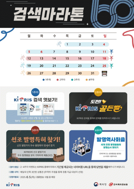 [NWS¹æ¼Û=Çѽ¸ñ ±âÀÚ]ƯÇãûÀº ¹ß¸íÀÇ ³¯ 60ÁÖ³âÀ» ¸Â¾Æ ±¹¹ÎÀÇ Áö½ÄÀç»ê¿¡ ´ëÇÑ °ü½ÉÀ» ³ôÀ̰íÀÚ 5¿ù 1ÀÏ~31ÀϱîÁö 'ŰÇÁ¸®½º(KIPRIS) °Ë»ö ¸¶¶óÅæ' Çà»ç(À̺¥Æ®)¸¦ °³ÃÖÇÑ´Ù°í ¹àÇû´Ù. À̹ø À̺¥Æ®´Â Áö½ÄÀç»êÁ¤º¸°Ë»ö¼­ºñ½º ´©¸®Áý¡¦