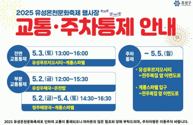 [NWS¹æ¼Û=Çѽ¸ñ ±âÀÚ]´ëÀü À¯¼º±¸°¡ 5¿ù 2ÀϺÎÅÍ 4ÀϱîÁö ¿­¸®´Â ¡®2025 À¯¼º¿Âõ¹®È­ÃàÁ¦¡¯¸¦ ¾ÈÀüÇÑ ÃàÁ¦·Î ¸¸µé±â À§ÇØ ÃÑ·ÂÀüÀ» ÆîÄ£´Ù. À̸¦ À§ÇØ À¯¼º±¸´Â 5¿ù 2ÀÏ ¿ÀÀü 9½ÃºÎÅÍ 4ÀÏ ¿ÀÈÄ 10½Ã±îÁö ¿Âõ·Î¿Í ÁÖº¯ µµ·Î¿¡ ´ëÇØ ±³¡¦