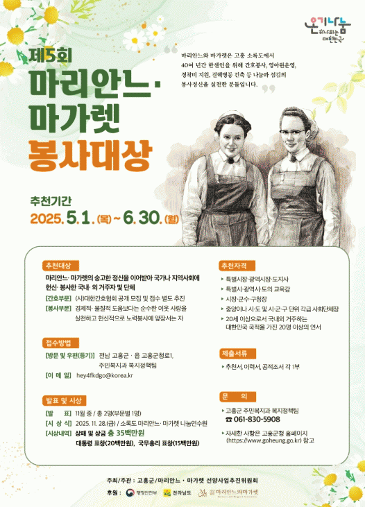 [»çȸ] °íÈﱺ, ¡®Á¦5ȸ ¸¶¸®¾È´À¡¤¸¶°¡·¿ ºÀ»ç´ë»ó¡¯ Èĺ¸ÀÚ Ãßõ °ø¸ð |2025. 05.01