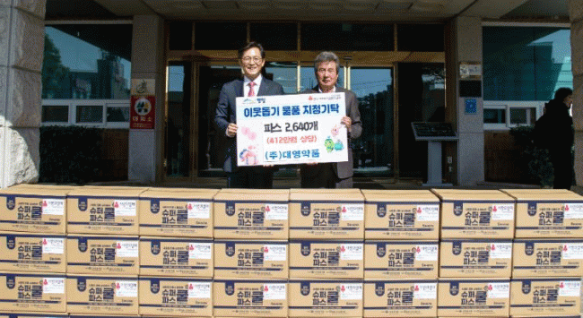 [NWS¹æ¼Û=Çѽ¸ñ ±âÀÚ]¢ß´ë¿µ¾àǰÀÌ 4/29ÀÏ Ãë¾à°èÃþ¿¡°Ô ³ª´²´Þ¶ó¸ç 400¸¸¿ø »ó´çÀÇ ÆÄ½º 2,640°³¸¦ ¿µ¾Ï±º¿¡ Àü´ÞÇß´Ù. ¹Ú ´ëÇ¥ÀÌ»ç´Â ¡°¿µ¾Ï±º Ãë¾à°èÃþ¿¡ µµ¿òÀ» ÁÙ ¼ö ÀÖ¾î ¶æ±í´Ù¡±°í ¸»Çß´Ù. ³ªÁֽà ±Ýõ¸é¿¡ ¼ÒÀçÇÑ ¢ß´ë¿µ¾à¡¦