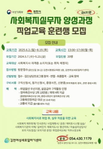 [NWS¹æ¼Û=Çѽ¸ñ ±âÀÚ] ±èõ½Ã Æò»ý±³À°¿ø ¿©¼º»õ·ÎÀÏÇϱ⼾ÅÍ´Â »çȸº¹Áö ºÐ¾ß·ÎÀÇ Ãë¾÷À» Èñ¸ÁÇÏ´Â ¿©¼ºÀ» ´ë»óÀ¸·Î 2025³â »çȸº¹Áö ½Ç¹«ÀÚ ¾ç¼º°úÁ¤ Á÷¾÷±³À°ÈƷûýÀ» ¸ðÁýÇÑ´Ù. ¸ðÁý ±â°£Àº 5¿ù 7ÀϺÎÅÍ 5¿ù 23ÀϱîÁöÀ̸ç, ±³À°Àº¡¦