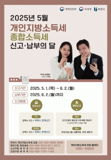 [NWS¹æ¼Û=Çѽ¸ñ ±âÀÚ]ºÎõ½Ã´Â ¡®5¿ù °³ÀÎÁö¹æ¼Òµæ¼¼¿Í Á¾Çռҵ漼 ½Å°í¡¤³³ºÎÀÇ ´Þ¡¯À» ¸Â¾Æ, 5¿ù 1ÀϺÎÅÍ 6¿ù 2ÀϱîÁö ºÎõ½Ãû 3Ãþ ¼ÒÅë ¸¶´ç¿¡ ±¹¼¼-Áö¹æ¼¼ ÅëÇÕ ½Å°í ⱸ¸¦ ¿î¿µÇÑ´Ù. Á¾ÇÕ¼ÒµæÀº »ç¾÷¡¤±Ù·Î¡¤ÀÌÀÚ¡¤¹è´ç¡¤¿¬±Ý¡¤¡¦