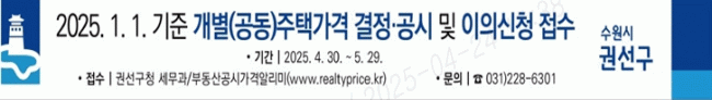 [NWS¹æ¼Û=Çѽ¸ñ ±âÀÚ]¼ö¿ø½Ã ±Ç¼±±¸´Â 2025³â 1¿ù 1ÀÏ ±âÁØ, °³º°ÁÖÅà 9,402È£ÀÇ °¡°Ý¿¡ ´ëÇØ Áö³­ 30ÀÏ¿¡ °áÁ¤¡¤°ø½ÃÇϰí, 5¿ù 29ÀϱîÁö ÀÌÀǽÅû Á¢¼ö ±â°£À» ¿î¿µÇÑ´Ù°í ¹àÇû´Ù. ±Ç¼±±¸ÀÇ °³º°ÁÖÅð¡°ÝÀº Àü³â ´ëºñ 2.97% »ó½ÂÇßÀ¸¸ç¡¦