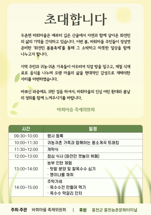 [NWS¹æ¼Û=Çѽ¸ñ ±âÀÚ]¹Ùȸ¸¶À» È­Àü¹Î º½º½ÃàÁ¦°¡ ¿À´Â 5¿ù 2ÀÏ È«Ãµ±º µÎÃÌ¸é ¹Ùȸ¸¶À» Ãʰ¡Ã¼ÇèÃÌ ÀÏ¿ø¿¡¼­ °³ÃֵȴÙ. À̹ø ÃàÁ¦´Â ¸¶À»Áֹΰú ±Í³ó¡¤±ÍÃÌ °¡Á·µéÀÌ ÇÔ²² ¾î¿ï¸®´Â Áö¿ª Ä¿¹Â´ÏƼ ±â¹Ý Çà»ç·Î, »ê³ª¹°ÃàÁ¦ ±â°£¿¡ ¸Â¡¦