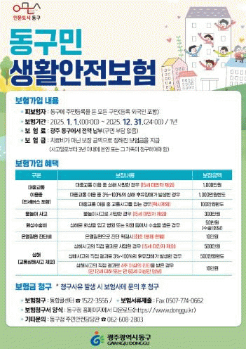 [NWS¹æ¼Û=Çѽ¸ñ ±âÀÚ]±¤ÁÖ µ¿±¸´Â ÀÏ»ó»ýȰ ¼Ó ¿¹±âÄ¡ ¾Ê°Ô ¹ß»ýÇÏ´Â °¢Á¾ »ç°í¿Í Àç³­À¸·ÎºÎÅÍ ÇÇÇØ¸¦ ÀÔÀº ÁÖ¹ÎÀ» º¸È£Çϱâ À§ÇÑ ¡®µ¿±¸¹Î »ýȰ¾ÈÀüº¸Ç衯 ¼­ºñ½º¸¦ ½ÃÇà ÁßÀ̶ó°í ¹àÇû´Ù. ¡®µ¿±¸¹Î »ýȰ¾ÈÀüº¸Ç衯Àº º¸Çè·á Àü¾×À»¡¦