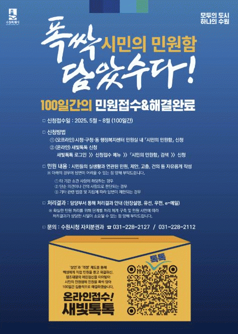 [»çȸ] ¼ö¿ø½Ã, Á¤Á¶´ë¿ÕÀÇ »ó¾ð¡¤°ÝÀï °è½ÂÇÑ '½Ã¹ÎÀÇ ¹Î¿øÇÔ' 100ÀÏ µ¿¾È ¿î¿µÇÑ´Ù |2025. 05.01