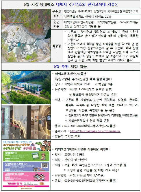 [NWS¹æ¼Û=Çѽ¸ñ ±âÀÚ]°­¿øÆ¯º°ÀÚÄ¡µµ´Â 2025³â 5¿ù ÁöÁú¡¤»ýŸí¼Ò·Î Źé½ÃÀÇ '±¸¹®¼Ò¿Í Àü±â°í»ý´ë ÁöÃþ'À» ¼±Á¤Çß´Ù°í ¹àÇû´Ù. ÅÂ¹é ±¸¹®¼Ò(Źé½Ã Źé·Î 2249)´Â ȲÁöõ°ú ö¾ÏõÀÌ ÁöÇÏ µ¿±¼°ú ¸¸³ª Çü¼ºµÈ Çù°î ÁöÇüÀ¸·Î¡¦
