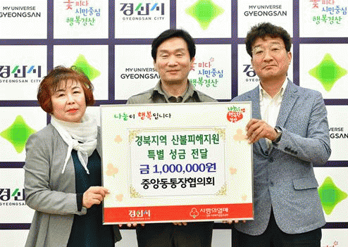 [NWS¹æ¼Û=Çѽ¸ñ ±âÀÚ]Áß¾Óµ¿ÅëÀåÇùÀÇȸ´Â 30ÀÏ °æ»ê½ÃûÀ» ¹æ¹®ÇÏ¿© »êºÒ·Î »îÀÇ ÅÍÀüÀ» ÀÒÀº ÀÌ¿ôµé¿¡°Ô ÀÛÀº À§·Î¿Í Èñ¸ÁÀ» ÀüÇϰíÀÚ ½Ê½ÃÀÏ¹Ý ¸ðÀº ¼º±Ý 100¸¸¿øÀ» ±âŹÇß´Ù. À̳¯ ¼º±Ý±âŹÀº °©ÀÛ½º·¯¿î »êºÒÇÇÇØ·Î ¸¶À½±îÁö ÁöÄ£ ¡¦