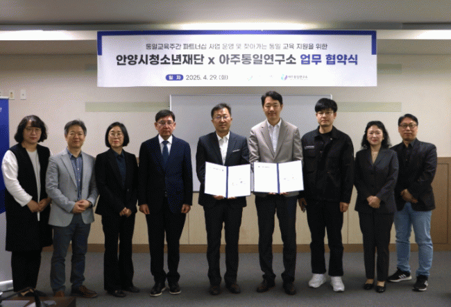 [NWS¹æ¼Û=Çѽ¸ñ ±âÀÚ]¾È¾ç½Ãû¼Ò³âÀç´ÜÀº 29ÀÏ ¾ÆÁÖÅëÀÏ¿¬±¸¼Ò¿Í ÅëÀϱ³À°ÁÖ°£ ÆÄÆ®³Ê½Ê »ç¾÷ ¿î¿µ ¹× ã¾Æ°¡´Â ÅëÀÏ ±³À° Áö¿øÀ» À§ÇÑ ¾÷¹«Çù¾àÀ» ü°áÇß´Ù°í 30ÀÏ ¹àÇû´Ù. ¾ÆÁÖÅëÀÏ¿¬±¸¼Ò´Â ÅëÀÏ ¹®Á¦ ¿¬±¸ ¹× ÅëÀÏ ±³À° Áö¿øÀ» À§ÇØ¡¦