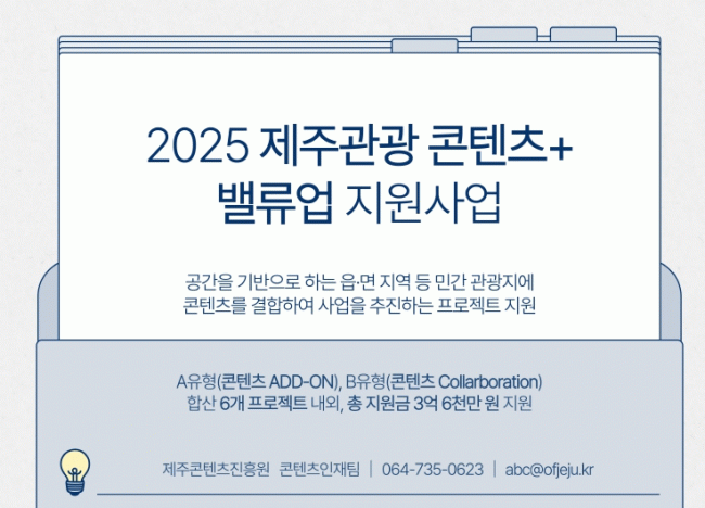 [NWS¹æ¼Û=Çѽ¸ñ ±âÀÚ]Á¦ÁÖÄÜÅÙÃ÷ÁøÈï¿øÀº °í¿ë³ëµ¿ºÎ, Á¦ÁÖÆ¯º°ÀÚÄ¡µµ¿Í Çù·ÂÇÏ¿© Á¦ÁÖ °ü±¤°ú ÄÜÅÙÃ÷¸¦ °áÇÕÇÑ ½Å±Ô»ç¾÷ ¡¸2025 Á¦ÁÖ°ü±¤ ÄÜÅÙÃ÷+ ¹ë·ù¾÷ Áö¿ø»ç¾÷¡¹¿¡ Âü¿©ÇÒ ±â¾÷À» ¸ðÁýÇÑ´Ù. º» »ç¾÷Àº Àü½Ã°ü, ¹Ú¹°°ü, üÇè°ø°£ ¡¦