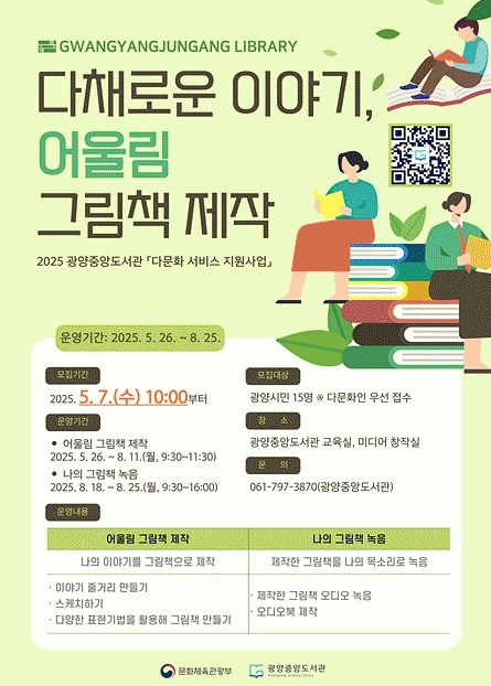 [NWS¹æ¼Û=Çѽ¸ñ ±âÀÚ]±¤¾çÁß¾Óµµ¼­°üÀº ¹®È­Ã¼À°°ü±¤ºÎ°¡ ÁÖ°üÇÏ´Â '2025³â ´Ù¹®È­ ¼­ºñ½º Áö¿ø»ç¾÷' ¼öÇà±â°üÀ¸·Î ¼±Á¤µÅ, ¿À´Â 5¿ù 26ÀϺÎÅÍ 8¿ù 25ÀϱîÁö ±¤¾ç½Ã °ÅÁÖ ´Ù¹®È­ÀÎÀ» ´ë»óÀ¸·Î ¡®´Ù(Òý)ä·Î¿î À̾߱â, ¾î¿ï¸² ±×¸²Ã¥ Á¦ÀÛ¡¦