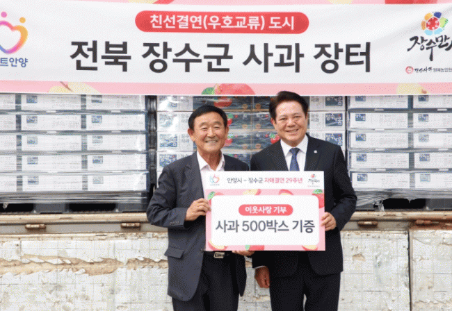 [NWS¹æ¼Û=Çѽ¸ñ ±âÀÚ]¾È¾ç½Ã´Â ÀüºÏ Àå¼ö±ºÀ¸·ÎºÎÅÍ Áö¿ª Ư»ê¹°ÀÎ »ç°ú 500¹Ú½º(1,500¸¸¿ø »ó´ç)¸¦ ±âºÎ¹Þ¾Æ °ü³» »çȸº¹Áö½Ã¼³¿¡ Àü´ÞÇß´Ù°í 24ÀÏ ¹àÇû´Ù. À̹ø ±âºÎ´Â ¾ç µµ½ÃÀÇ Ä£¼± °á¿¬ 29ÁÖ³âÀ» ±â³äÇØ ûÁ¤ ÀÚ¿¬ ¼Ó¿¡¼­ Àç¹èÇÑ¡¦