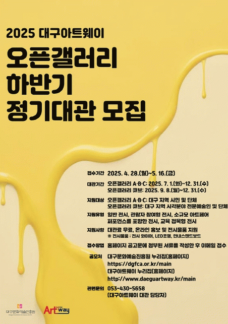 [NWS¹æ¼Û=Çѽ¸ñ ±âÀÚ]´ë±¸¹®È­¿¹¼úÁøÈï¿ø ´ë±¸¾ÆÆ®¿þÀÌ´Â 4¿ù 28ÀϺÎÅÍ 5¿ù 16ÀϱîÁö 2025³âµµ ÇϹݱ⠿Àǰ¶·¯¸® Á¤±â´ë°ü ¸ðÁýÀ» ÁøÇàÇÑ´Ù. ¿Àǰ¶·¯¸®´Â ¾ÆÆ®¿þÀÌ ³» À¯ÈÞ°ø°£À» Ȱ¿ëÇØ Á¶¼ºÇÑ Àü½Ã °ø°£ÀÌ´Ù. º®¸é Àü½ÃÀåÀÎ A(¹ü¡¦