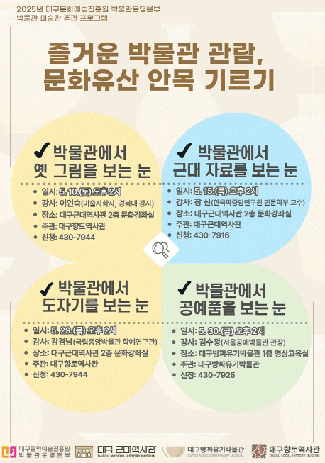 [NWS¹æ¼Û=Çѽ¸ñ ±âÀÚ] (Àç)´ë±¸¹®È­¿¹¼úÁøÈï¿ø ¹Ú¹°°ü¿î¿µº»ºÎ ¼Ò¼Ó ´ë±¸ ½Ã¸³ 3°³ ¹Ú¹°°üÀÎ ´ë±¸±Ù´ë¿ª»ç°ü¡¤´ë±¸¹æÂ¥À¯±â¹Ú¹°°ü¡¤´ë±¸ÇâÅ俪»ç°ü¿¡¼­´Â ¡®2025 ¹Ú¹°°ü¡¤¹Ì¼ú°ü ÁÖ°£¡¯À» ¸Â¾Æ 5¿ù 2ÀϺÎÅÍ 6¿ù 1ÀϱîÁö ´Ùä·Î¿î ¹®È­Çࡦ