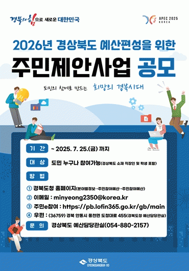 [NWS¹æ¼Û=Çѽ¸ñ ±âÀÚ]°æ»óºÏµµ´Â ¿¹»êÆí¼ºÀÇ Åõ¸í¼º°ú °øÁ¤¼ºÀ» ³ôÀ̱â À§ÇØ 7¿ù 25ÀϱîÁö 2026³âµµ °æ»óºÏµµ ÁÖ¹ÎÂü¿©¿¹»ê Æí¼ºÀ» À§ÇÑ ÁֹΠÁ¦¾È »ç¾÷À» °ø¸ðÇÑ´Ù. ÁÖ¹ÎÂü¿©¿¹»êÁ¦´Â µµ¹ÎÀÌ Á÷Á¢ »ç¾÷À» Á¦¾ÈÇÏ°í ¿¹»êÆí¼ººÎÅÍ ÁýÇà,¡¦