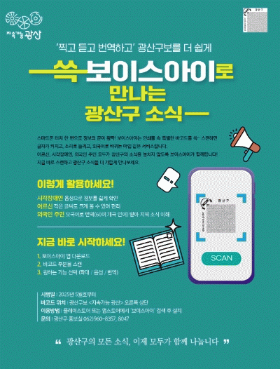 [NWS¹æ¼Û=Çѽ¸ñ ±âÀÚ]±¤ÁÖ ±¤»ê±¸´Â ½Ã°¢Àå¾ÖÀÎ, °í·ÉÀÚ, ¿Ü±¹ÀÎ ÁֹΠµî Á¤º¸ Á¢±ÙÀÌ ¾î·Á¿î ½Ã¹ÎµéÀ» À§ÇØ ±¤»ê±¸º¸ 5¿ùÈ£ºÎÅÍ ¡®º¸À̽º ¾ÆÀÌ(VOICE-EYE)¡¯ ¼­ºñ½º¸¦ µµÀÔÇÑ´Ù°í 30ÀÏ ¹àÇû´Ù. º¸À̽º ¾ÆÀÌ(VOICE-EYE)´Â Àü¿ë ¹ÙÄڵ带¡¦