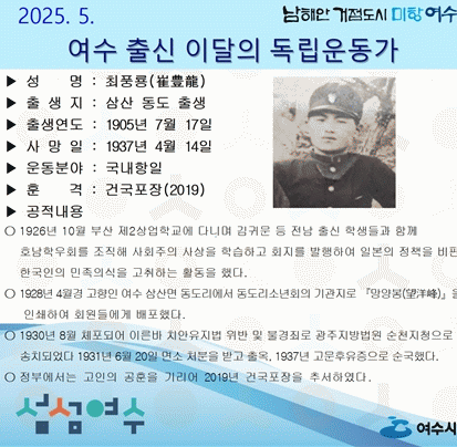 [NWS¹æ¼Û=Çѽ¸ñ ±âÀÚ]¿©¼ö½Ã°¡ 2025³â 5¿ùÀÇ µ¶¸³¿îµ¿°¡·Î »ï»ê¸é µ¿µµ¸® Å»ý ¡®ÃÖdz·æ(õËù¥×£)¡¯ ¼±»ýÀ» ¼±Á¤Çß´Ù. ÃÖdz·æ ¼±»ýÀº 1905³â 7¿ù 17ÀÏ Å»ýÀ¸·Î 1926³â 10¿ù ºÎ»ê Á¦2»ó¾÷Çб³¿¡ ´Ù´Ï¸ç ±è±Í¹® µî Àü³² Ãâ½Å Çлýµé°ú ÇÔ¡¦
