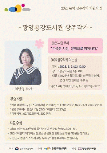 [»çȸ] ÃÖ³­¿µ ¼Ò¼³°¡, 2025 ±¤¾ç½Ã ¹®ÇлóÁÖÀÛ°¡·Î ¼±Á¤ |2025. 04.30