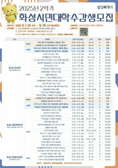 [NWS¹æ¼Û=Çѽ¸ñ ±âÀÚ]È­¼ºÆ¯·Ê½Ã°¡ 5¿ù 1ÀϺÎÅÍ 14ÀϱîÁö ¡®2025³â È­¼º½Ã¹Î´ëÇÐ 2Çб⡯ ¼ö°­»ýÀ» ¼±Âø¼øÀ¸·Î ¸ðÁýÇÑ´Ù. À̹ø 2Çб⠰úÁ¤¿¡¼­´Â °­ÀÇ¾È Á¦¾È °ø¸ð¸¦ ÅëÇØ ¼±Á¤µÈ âÀǼº°ú Àü¹®¼ºÀÌ °­È­µÈ ´Ù¾çÇÑ ±³À°°úÁ¤À» ¼±º¸Àδ١¦