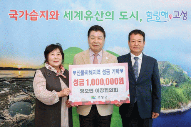 [NWS¹æ¼Û=Çѽ¸ñ ±âÀÚ]°í¼º±º ¿µ¿À¸é ÀÌÀåÇùÀÇȸ´Â 4¿ù 29ÀÏ °í¼º±ºÃ» 3Ãþ Áý¹«½Ç¿¡¼­ ¿µ³²Áö¿ª »êºÒ ÇÇÇØ¸¦ Áö¿øÇϱâ À§ÇØ 100¸¸ ¿øÀÇ ¼º±ÝÀ» ±âŹÇß´Ù. ¹è»ïÅ ȸÀåÀº ¡°¿µ¿À¸é ÀÌÀå 15¸íÀÌ ¿µ³óȰµ¿ºñ¸¦ ¸ð¾Æ¼­ ±âºÎÇÏ°Ô µÆ´Ù¡±¶ó¸ç,¡¦