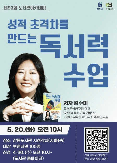 [NWS¹æ¼Û=Çѽ¸ñ ±âÀÚ]ºÎõ½Ã »óµ¿µµ¼­°üÀº °¡Á¤ÀÇ ´ÞÀ» ¸Â¾Æ 5¿ù 20ÀÏ ¿ÀÀü 10½Ã, ¡®¼ºÀû ÃʰÝÂ÷¸¦ ¸¸µå´Â µ¶¼­·Â ¼ö¾÷¡¯ÀÇ ÀúÀÚÀÌÀÚ µ¶¼­¹®È­¿¬±¸¿ø ´ëÇ¥ÀÎ ±è¼ö¹Ì °­»ç¸¦ ÃÊÃ»ÇØ Á¦93ȸ µµ¼­°ü ¾ÆÄ«µ¥¹Ì¸¦ ¿¬´Ù. À̹ø °­¿¬Àº °¡Á¤ÀÇ ¡¦