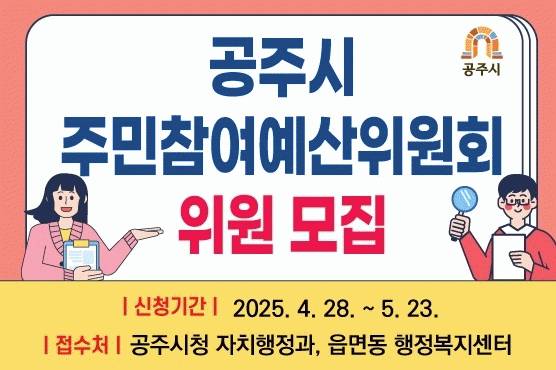 [»çȸ] °øÁÖ½Ã, Á¦6±â ÁÖ¹ÎÂü¿©¿¹»ê À§¿ø 60¸í ¸ðÁý |2025. 04.30