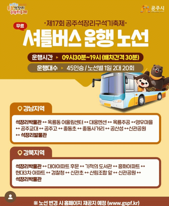 [NWS¹æ¼Û=Çѽ¸ñ ±âÀÚ]°øÁֽô ¿À´Â 5¿ù 3ÀϺÎÅÍ 6ÀϱîÁö ³ªÈê°£ ¿­¸®´Â ¡®Á¦17ȸ °øÁÖ ¼®À帮 ±¸¼®±âÃàÁ¦¡¯ ±â°£ µ¿¾È °ü¶÷°´ÀÇ Æí¸®ÇÑ Çà»çÀå Á¢±ÙÀ» µ½±â À§ÇØ ¹«·á ¼ÅƲ¹ö½º¸¦ ¿îÇàÇÑ´Ù°í ¹àÇû´Ù. ½Ã´Â À̹ø ÃàÁ¦¸¦ ¸Â¾Æ 45Àν ¼Å¡¦