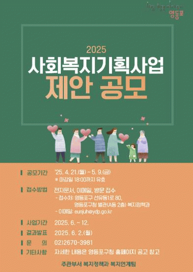 [NWS¹æ¼Û=Çѽ¸ñ ±âÀÚ]¿µµîÆ÷±¸°¡ ÇöÀå Áß½ÉÀÇ Âü½ÅÇÏ°í ½ÇÈ¿¼º ÀÖ´Â º¹Áö ÇÁ·Î±×·¥ ¹ß±¼À» À§ÇØ ¡®»çȸº¹Áö ±âȹ»ç¾÷¡¯ Á¦¾È °ø¸ð¸¦ ¿À´Â 5¿ù 9ÀϱîÁö ÁøÇàÇÑ´Ù°í ¹àÇû´Ù. °ø¸ð ´ë»óÀº »çȸº¹Áö »ç¾÷ ¹× Ȱµ¿À» ÇÏ´Â ºñ¿µ¸® ¹ýÀÎ?±â°ü?¡¦